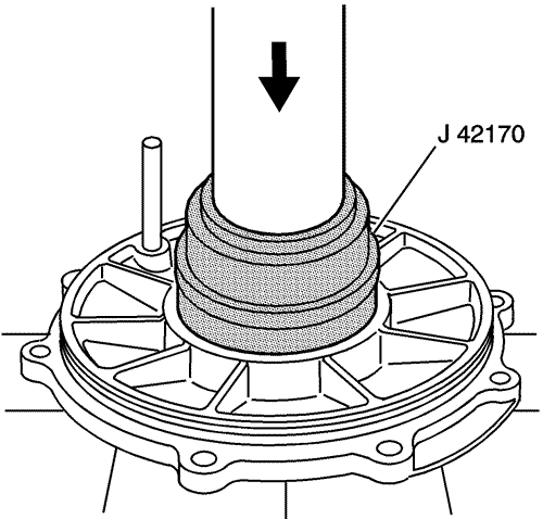 - Press the shims and bearing race into the NEW cover (right) using the J 42170 and a hydraulic press.