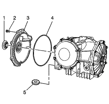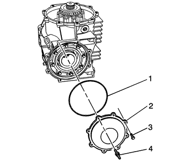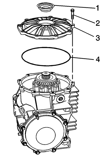 - Install the cover - rear (2), bolts (3), bolt/stud (4), and O-ring (1). Tighten Tighten the bolts and bolt/stud to 10 N·m (89 lb in).