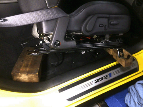 - Using wood blocks or similar material, tilt and support the seat in the vehicle as shown.