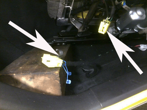 - Locate the yellow harness connector. Disconnect the seat side connector from the vehicle side connector.
