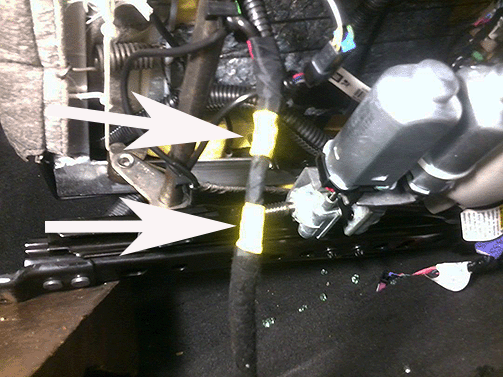 - Using a cable tie, secure the harness to the FRONT seat cross bar.