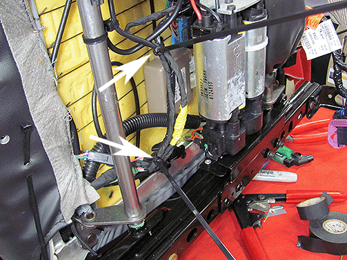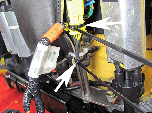 - Secure the wire connector and harness to the FRONT seat cross bar using two cable ties.