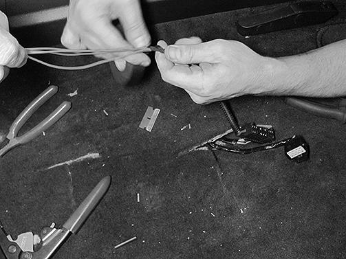 - On the seat side service connector, strip off approximately 13 mm (1/2 in) of insulation from the wiring ends. Fold the wires.