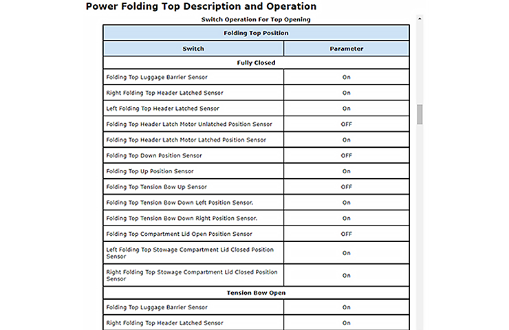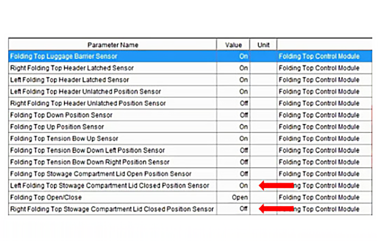 If no DTCs are set, follow the applicable folding top sensor matrix in the Service Information. The matrix for each vehicle may be located in the Description and Operation section or it may be located in a separate bulletin/PIC. The matrix lists all the various switches and sensors in the folding top system, including what each one should be reading based on where the top is at in its cycle. (Fig. 3)