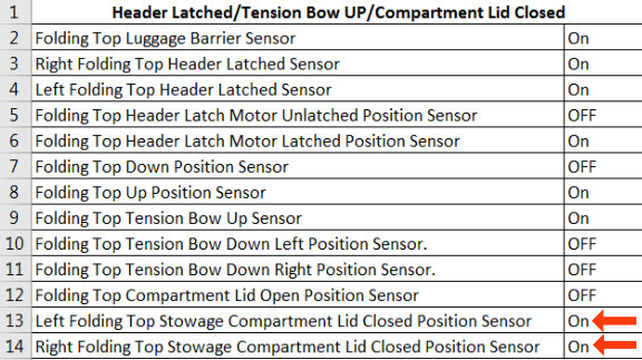 As with all customer concerns, the first step in diagnosing a folding top issue is to fully understand the customer’s description of the concern. In many instances, what the customer describes is not exactly what is found by the technician when he or she inspects the vehicle. Understanding what happened, or what the customer did, right before the concern began, is crucial to correctly diagnosing the folding top. Once the concern or the symptom is understood, the next step is operating the folding top to determine what works, and where does the top stop moving during its cycle. Just because the top operates in one direction, or some functions of the top will work, this does not necessarily mean that the top will operate correctly in the opposite direction. For example, on the Cadillac XLR, the decklid opens as part of the normal folding top opening cycle. In many cases, the rear compartment will open and close correctly all by itself, but it will not operate at all when the folding top is cycled. An important step often overlooked by many technicians in the field is to look for any folding top related messages in the DIC during operation. In many cases, there will be a "Top Not Secure" or a "Only Manual Operation of Top Possible" message displayed. With a "Top Not Secured" message for instance, this indicates that the top is somewhere in the middle of the cycle. It only indicates that the top is not fully closed, nor is it fully open. It simply indicates that it is somewhere in between. By itself, this is not an indication of a fault with the folding top system. The next step in diagnosing a power folding top concern is to check for any DTCs that may have set and follow the applicable flowchart in Service Information. If no codes are found, the next step that must be completed is to follow the applicable folding top sensor matrix. This is essentially a chart of all the various switches and sensors in the folding top system. It tells the technician what each one SHOULD be reading, based on where the top is at in its cycle. With all folding top systems, the top opening or top closing cycle is broken down into a series of small steps, called phases. There can be any number of phases in a complete folding top cycle. A folding top must always complete the first phase before it continues on to the second phase. The folding top must complete the second phase before it continues on to the third phase, and so on. In most cases, the folding top will stop partway through its opening or closing cycle with no DTCs set. This is the most common type of customer concern. This is almost always the result of a sensor or switch that is simply not transitioning its status. If no wiring concern is present, then no DTC will be set, generally speaking. The matrix is used at that point to determine which switch or sensor is not transitioning correctly, and therefore, will require a closer inspection. The matrix for each vehicle can be found in SI. It may be located in Description and Operation, or it may be located in a separate bulletin / PIC. Regardless, this chart is essential to diagnosing a concern within the folding top system. The top must then be operated until the point where it stops moving. Only press and hold the folding top switch one time. Once the top stops moving, do not keep pressing the top switch to try and get the folding top to keep moving. Release the switch and use the scan tool to monitor each one of the folding top position sensors / switches. Run down the matrix to see what each sensor should read, and compare this to the scan tool information for what each sensor is actually reading. At least one parameter should be incorrect. This is the switch or sensor that will require closer inspection. If only one parameter is incorrect, this area will need to be further diagnosed. The tech will need to first determine if this is a mechanical issue or if it is electrical. Determine if the linkage is bent or did the sensor move out of position? Is the sensor’s corresponding magnet missing, or was a wiring fault found? Is the panel simply misaligned? This will at least narrow the concern down to one specific area. Example Case: Let’s take a 2018 Chevrolet Camaro for instance, with a basic folding top concern. The customer states that the top will open fine, but it will not close all the way. A preliminary check will indicate that there is a "Top Not Secure" message in the DIC, but no DTCs are set. The tech is able to duplicate the concern each and every time. When closing, the top will lift up out of the stowage compartment, latch tightly to the windshield header, and the tension bow will lift up to a 45° angle. The Rear Stowage Compartment Lid will lower and lock into position, but the tension bow will not lower. It simply remains suspended in the air as seen in the photo below. The folding top pump quits working and the top stops moving at that point. ![]() On a correctly working car, the stowage compartment lid must close completely before the tension bow is commanded down. Because the steps or phases must be completed in order, the technician must go to the point where the failure occurs, and then go back one step to look at the scan tool data. If we look at the Folding Top matrix found in SI, we have the following parameters seen below. This particular vehicle has two separate Stowage Compartment Lid Closed Position Sensors. One is on the left hand linkage and the other is on the right hand linkage. On a working vehicle, both Stowage Compartment Lid Closed Position Sensors should read "On" when the lid is closed. ![]() Looking at the scan tool sensor data below, we can see that only one of the two Stowage Compartment Lid Closed Position Sensors read "On". Because the Folding Top Control Module will not command the tension bow to lower if both Stowage Compartment Lid Closed Position Sensors are not showing that they are closed, the module thinks that the stowage lid is still raised. As a