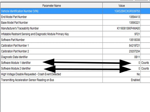 - If the value is greater than 0 for either of these parameters, replace the SDM. Refer to Airbag Sensing and Diagnostic Module Replacement in SI. Print the Identification Information screen and retain it with the Repair Order (RO).