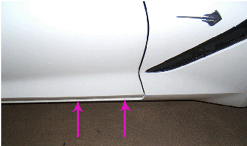 At the rear quarter panel, there is a clear tape-like material applied to the lower side of the rocker panels to protect against stone chips. When an object strikes this tape, it will leave a mark. The mark is not a defect. The material is there to provide some protection for the paint.