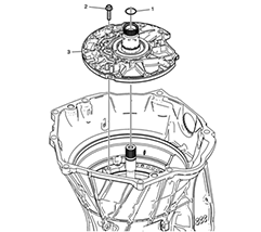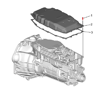 - Remove the fluid pan (2) and gasket (3). The fluid filter does not need to be removed.
