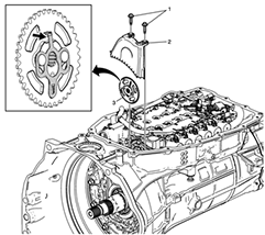 - Remove the driven sprocket (3) from the oil pump shaft leaving the drive link (chain) loose in the case.
