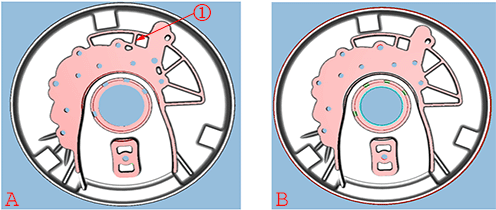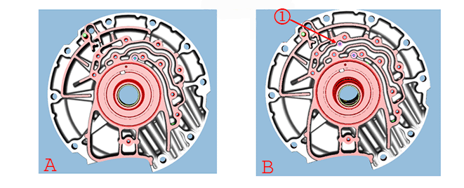 (A) Old cover - 8L90 Only (B) New cover - 8L90 Only Note: The casting void has been eliminated from the underside of the cover for the 8L90 only (see illustration). The 8L45 is not required.