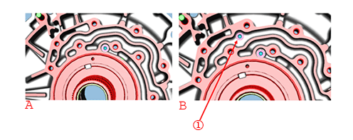 (A) Old stator support asm (B) New stator support asm Note: The new stator shaft support assembly has a second check ball (1) added (see illustrations).