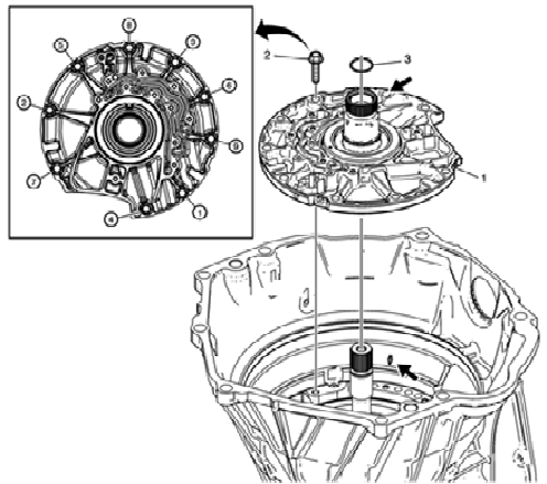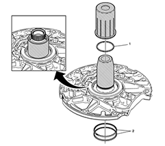 - Using the DT-50912 Seal Installer (8L90) or DT-51196 Seal Installer (8L45), install a NEW torque converter fluid seal (1) on the stator shaft support assembly. Size the seal using the DT-50912-1 Seal Sizer.