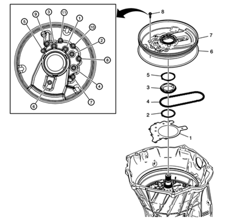 - Install the 11 NEW front cover bolts (8). Gradually tighten the bolts in the sequence shown. Tighten the bolts a first pass to 6.5-Y (58-lb-in). Tighten the bolts a final pass 30 Degrees.