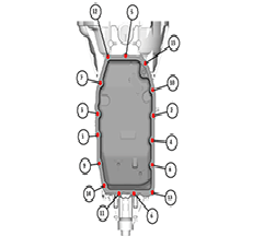 - Install the fluid pan and gasket and secure with 15 bolts. Tighten the bolts to 10 Y (89-lb-in) in the sequence shown.