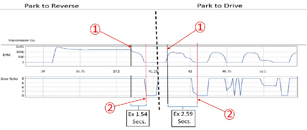 Delayed Engagement Park to Reverse or Drive is present if the time difference between Gear Selected (Pt. 1) and Transmission Input Shaft Speed reaching 0 RPMs (Pt. 2) exceeds 3 seconds. Foot is HELD on Brake during maneuver.