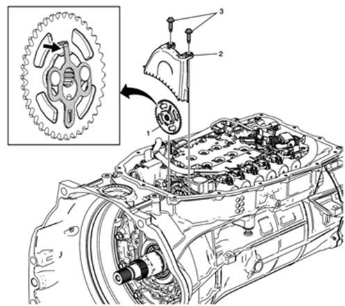 - Install the drive link (chain) to the driven sprocket (1) and then install the driven sprocket to the oil pump shaft. Rotate the sprocket as shown and push down on the tab until it locks the driven sprocket in place.