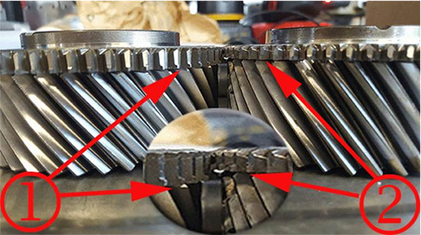 If the transmission does not hop out of 3rd gear, shift back to 2nd gear and repeat the shifting and accelerating procedure 10 times. If the transmission does not hop out of 3rd gear, the transmission has the correctly machined gear. (Fig. 14, #1) If the hop out of 3rd gear is verified, there is a mis-machined gear (Fig. 14, #2) and the 3rd speed gear, synchronizer and shift collar should be replaced.