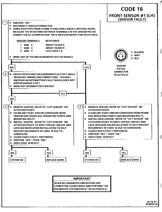 Severe corrosion under the sensor mounting bracket may cause a Code 16. Refer to "Left Sensor" on attached pages to remove sensor, inspect for corrosion, and correct corrosion if found. "Left Sensor" also instructs on use of special grease and washers to help prevent recurrence of Code 16 due to corrosion.