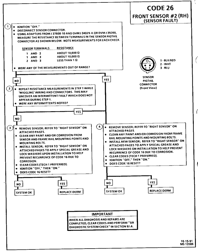 Some 1990 Corvettes have set SIR Sensor Codes 16 and 26. The DERM has detected an unacceptably high resistance between the SIR sensor and the frame rail, most likely due to a buildup of corrosion on the mounting surfaces. New service procedures have been developed to remove the corrosion and help prevent it from building up again. Diagnostic charts and removal and installation procedures, revised to address the corrosion issue, are attached. Please use these new procedures for all 1990 Corvette SIR Code 16 and Code 26 situations you encounter.