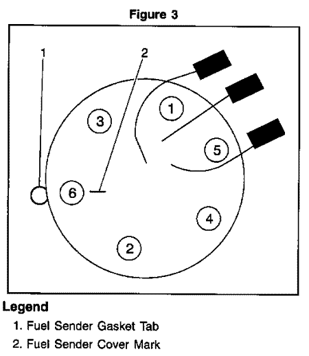 12. HAND TIGHTEN THE FUEL SENDER ATTACHING BOLTS UNTIL FINGER TIGHT. USING THE FUEL SENDER TORQUE TOOL (J 42940), TIGHTEN THE FUEL SENDER ATTACHING BOLTS TO 3 N.M IN THE SEQUENCE SHOWN IN (FIGURE 3). J 42940 WILL RATCHET WHEN THE PROPER TORQUE IS ATTAINED.