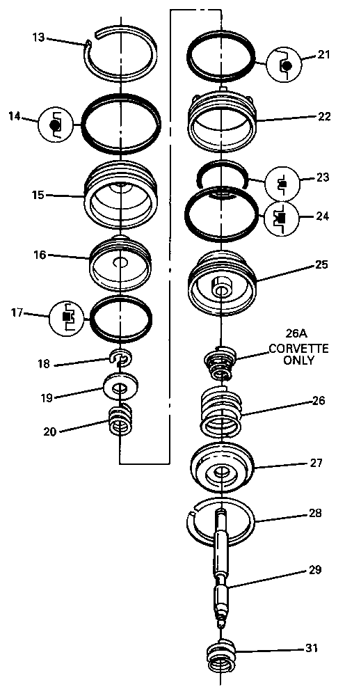 13 RING, SERVO COVER RETAINING 14 SEAL, "O’RING (2-4 SERVO COVER) 15 COVER, 2-4 SERVO 16 PISTON, 4TH APPLY 17 RING, OIL SEAL (4TH APPLY PISTON - OUTER) 18 RING, RETAINER (APPLY PIN) 19 WASHER, SERVO APPLY PIN 20 SPRING, SERVO APPLY PIN 21 SEAL, "O" RING 22 HOUSING, SERVO PISTON (INNER) 23 RING, OIL SEAL (2ND APPLY PISTON - INNER) 24 RING, OIL SEAL (2ND APPLY PISTON - OUTER) 25 PISTON, 2ND APPLY 26 SPRING, SERVO CUSHION 26A SPRING, SERVO CUSHION ASSIST (CORVETTE ONLY) 27 RETAINER, SERVO CUSHION SPRING 28 RING, RETAINER (2ND APPLY PISTON) 29 PIN, 2ND APPLY PISTON 31 SPRING, SERVO RETURN