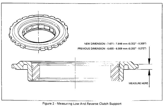 The only way to identify the new low and reverse clutch support is to measure its thickness with a micrometer. (See Figure 2.)